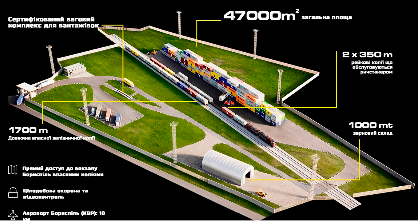 Інтермодальний логістичний термінал в м. Бориспіль – територія з спеціалізованою інфраструктурою логістичного спрямування для залізничних контейнерних перевезень та для ефективного перевантаження контейнерів між залізницею та автомобільним транспортом. Термінал включає: власну залізничну колію довжиною 2х350 м, яка обслуговується річстакером, сертифікованих ваговий комплекс для вантажівок, склад для стафірування агропромислової продукції місткістю 1000т., спеціалізований майданчик для складування морських контейнерів площею 47000кв.м.